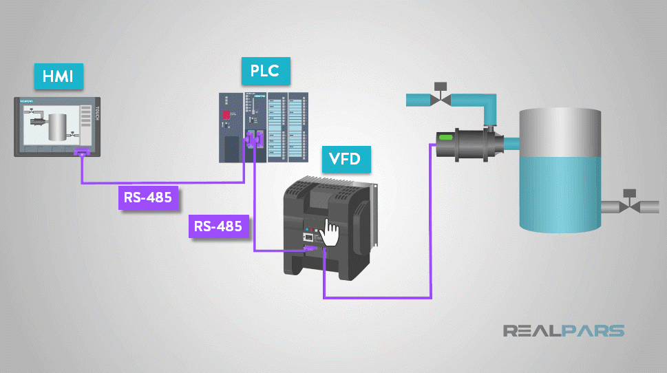 這是可能的,因為HMI通過RS485連接到PLC。PLC也通過RS485連接到VFD。