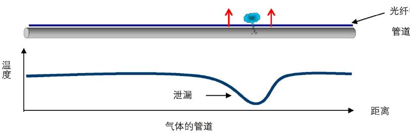 油氣管道泄漏時會引起泄漏點周圍溫度的變化,通過分布式光纖溫度傳感系統(tǒng)可以準確定位泄漏點。在天然氣管線介質泄漏受壓情況下,氣態(tài)物質導致的泄漏點的低溫,是由物質的物理性質、工藝條件和周圍環(huán)境所決定的。這些點的溫度異常可通過分布式溫度測量而獲得,并有很好的溫度、距離和反應時間精度。管道本身發(fā)生泄漏事故時,泄漏出的天然氣由于存在壓力,會向管道周圍發(fā)出噴射狀的氣體。如果能對整條天然氣管道在現(xiàn)有的壓力、流量探測技術基礎上,利用沿管道敷設的通訊光纜,接入分布式光纖測溫傳感主機,就能夠實時探測到泄漏點,并進行泄漏點的定位和報警顯示。