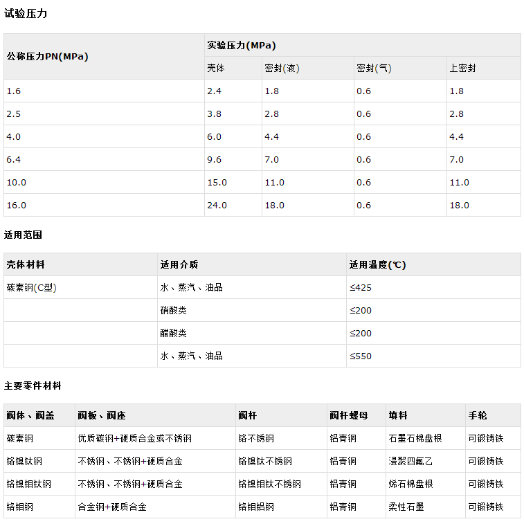 結構型式:彈性楔式單閘板、剛性楔式單閘板和雙閘板型式。 廣泛適用于石油化工,火力發(fā)電廠等油品、水蒸汽管路上作接通或截斷管路中介質的啟閉裝置。 主要性能規(guī)范
